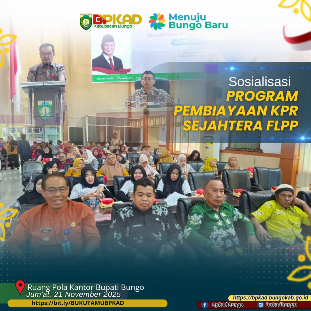 Lentera, Muara Bungo – Mewakili Bupati Bungo, Kepala Badan Pengelola Keuangan dan Aset Daerah (BPKAD) Kabupaten Bungo, M Rachmat, Resmi Membuka Sosialisasi Program Pembiayaan KPR Sejahtera dan Fasilitas Likuiditas Pembiayaan Perumahan (FLPP) di Ruang Pola, Kantor Bupati Bungo, Jum’at (21/11/2025).