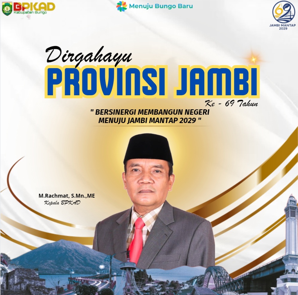 Lentera, Muara Bungo – Dalam momentum Peringatan Hari Ulang Tahun (HUT) ke-69 Provinsi Jambi, Kepala Badan Pengelolaan Keuangan dan Aset Daerah (BPKAD) Kabupaten Bungo, M. Rachmat, menyampaikan ucapan selamat sekaligus harapan untuk kemajuan Provinsi Jambi ke depan.